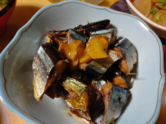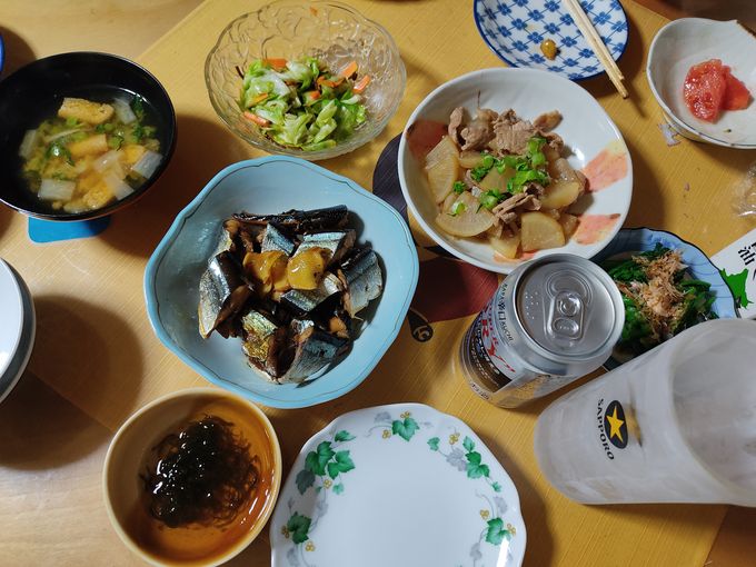 秋刀魚のさっぱり煮、大根豚肉煮、小松菜おひたし、キャベツ人参塩昆布和え、もずく酢