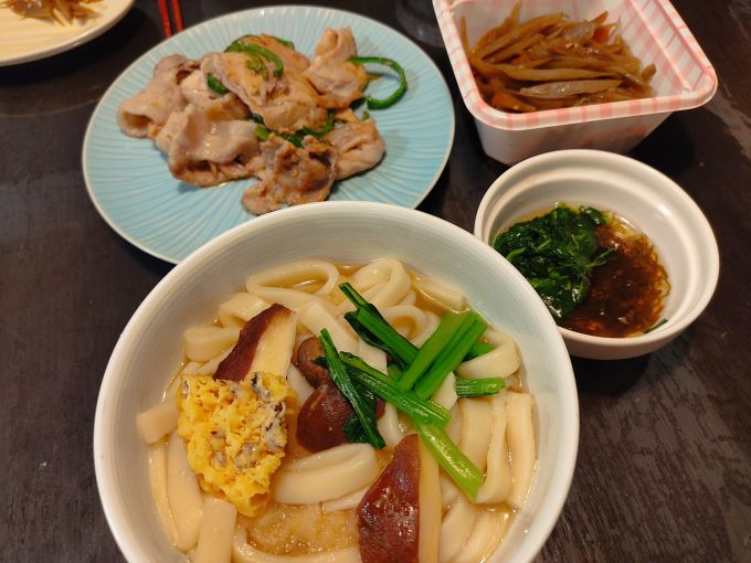 うどん(椎茸、小松菜、天かす)、豚肉生姜焼き、もずく酢+モロヘイヤ、きんぴらごぼう