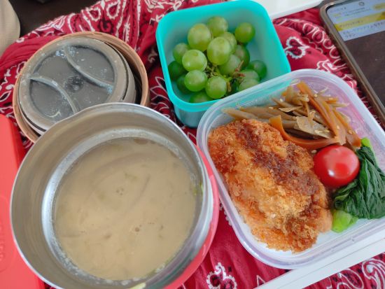 豆乳お味噌汁(白菜しめじベーコン)、鶏むねカツ(自家製冷凍チン)、きんぴら、小松菜、ミニトマト、ぶどう
