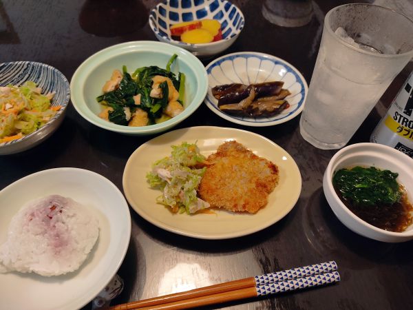 今日もバイトじゃ定時で上がり 2025.10.12 今日もバイトじゃ定時に上がり、ちょこっと買い物して急いで帰宅=3 スポンサーリンク 今日の食出費 1,243円 10月(1~31日)食費11,826円 今日の晩ご飯 梅干しおにぎり(ミニ)、ヒレカツ、鶏むねキャベツ胡麻ドレ和え、小松菜揚げ煮浸し、茄子ピリ辛煮、さつま芋はちみつレモン煮、もずく酢+モロヘイヤ オカン用にチンしたおにぎり、食べれないというので私が引き取る。 おかずをちょこっとずつ食べて、もうお腹いっぱいなオカンです。 ~明日はオトンが来るので(えー!)~