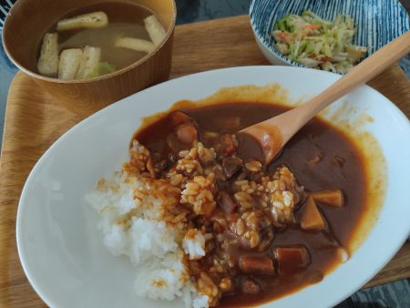 レトルトカレー、お味噌汁、キャベツ鶏むねマヨサラダ(残り物)
