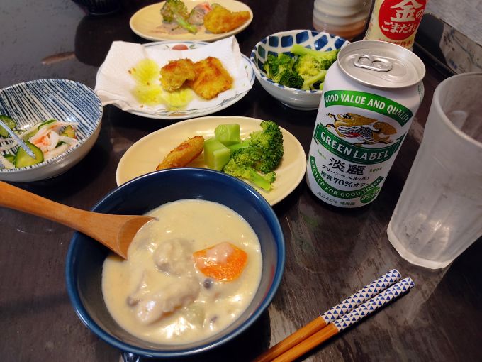 豆乳シチュー、鶏むねカレーパン粉焼、ブロッコリー、胡瓜カニカマかんたん酢