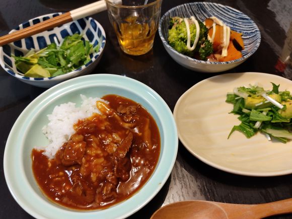 完熟トマトのハヤシライスソースで(牛肉、舞茸、玉葱)、アボカド水菜サラダ、南瓜ブロッコリーゴママヨサラダ