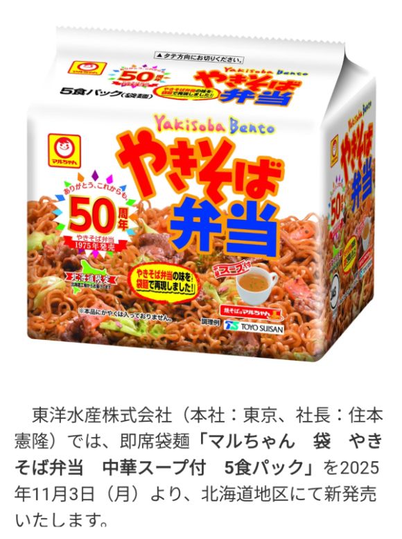 即席袋麺「マルちゃん 袋 やきそば弁当 中華スープ付 5食パック」を2025年11月3日(月)より、北海道地区にて新発売いたします。