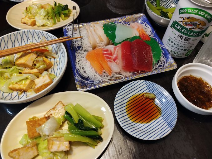 お刺し身、厚揚げキャベツ炒め(にんにく、味噌、砂糖、酒、みりん)、小松菜辛子和え、もずく酢
