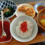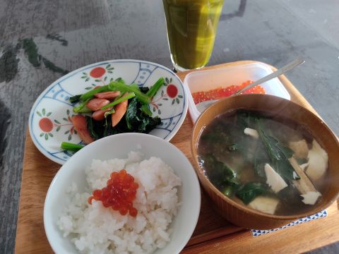 いくらごはん、お味噌汁(小松菜、豆腐、揚げ)、小松菜ウインナー炒め、人参小松菜ジュース