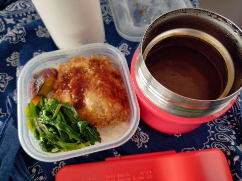 チキンカツ(自家製冷凍発掘)、ほうれん草炒め、焼き芋(一口サイズ)、カリー屋カレー