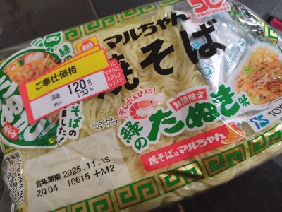 気になっていたマルちゃん焼そばの緑のたぬき味をご奉仕価格で発見、120円ならばと即決!
