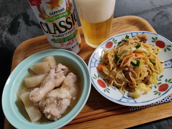 大根鶏手羽煮(xおかわりして完食)、マルちゃんやきそば緑のたぬき、サッポロクラシック富良野ヴィンテージ