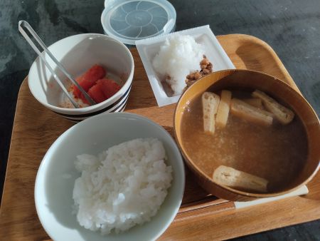 ごはん、お味噌汁(豆腐、しめじ、揚げ)、大根おろし納豆、明太子、人参りんごジュース