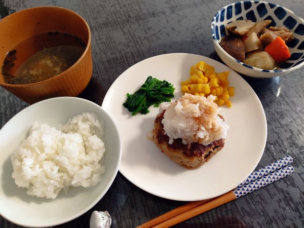 ごはん、あおさお味噌汁、ハンバーグポン酢おろし、コーン、ほうれん草、筑前煮