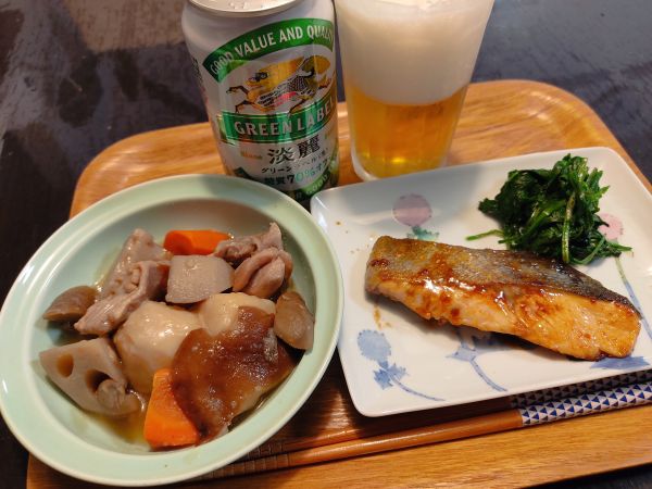 鮭バタポン焼き、ほうれん草、筑前煮、ビア