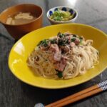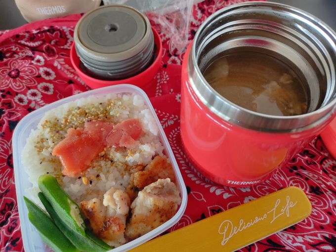 たらこ、ふりかけのっけごはん、塩唐揚げ、茹でオクラ、豚汁