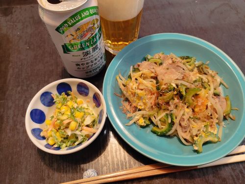 ゴーヤチャンプルー(ゴーヤ、もやし、豚肉、卵)、コールスローサラダ、淡麗グリーンラベル