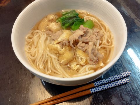 温ひやむぎ(豚肉、揚げ、小松菜)