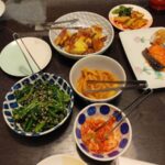 チキンカツ、ポテトサラダ、春菊胡麻和え、キムチ、なます