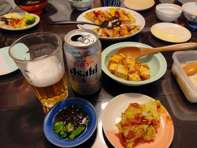 お昼の残りの麻婆豆腐、お好み焼き(豚イカ)、オクラもずく酢、長芋かんたん酢、茹でブロッコリー