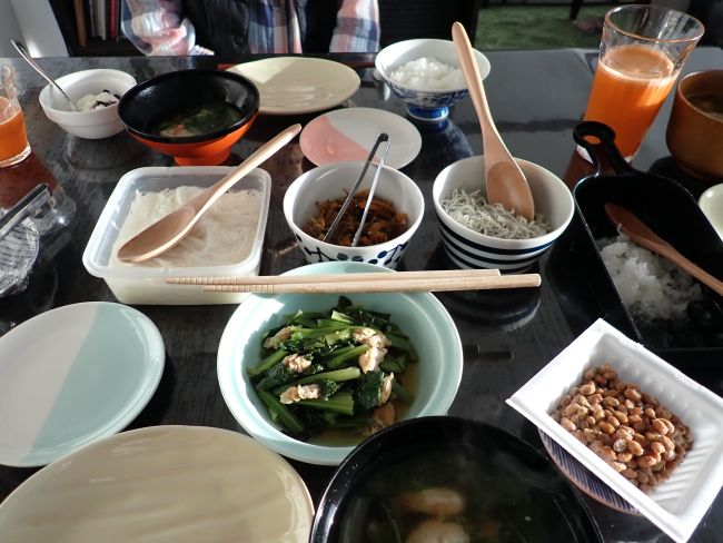 今日は長芋かんたん酢、松前漬、しらす、小松菜揚げ煮浸し、納豆、大根おろし、お味噌汁はかに入りすり身と白菜、ほうれん草。