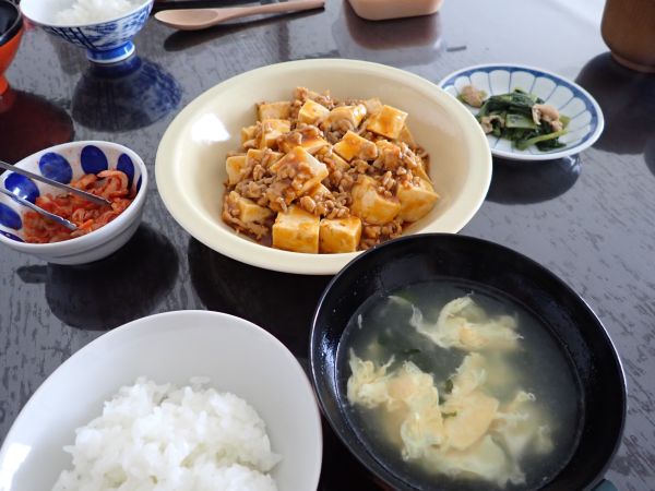 ごはん、麻婆豆腐(クックドゥで)、卵わかめスープ(創味シャンタン)、キムチ