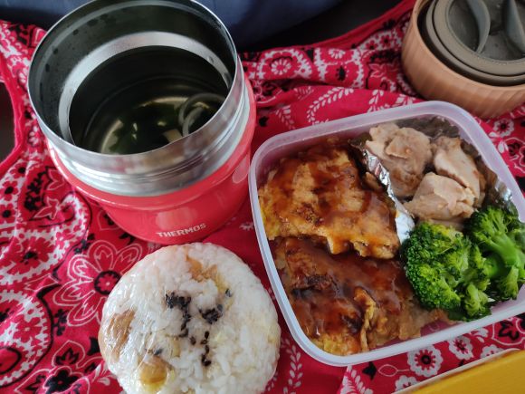 栗ご飯(冷凍チン)、お吸物、お好み焼き(昨晩残り)、鶏もも塩レモン焼き、ブロッコリー、プロテイン