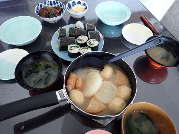 昨日作ったおでん、柚子大根、冬至かぼちゃ(昨晩残り)、ツナマヨサラダ巻き、わかめお味噌汁