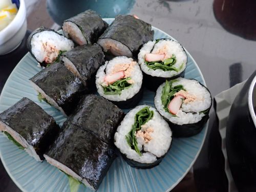 お昼は、冷蔵庫のレタスと、賞味期限がちょっと切れた海苔を消費しよかと、サラダ巻まで作る余裕(余裕、は自分比w