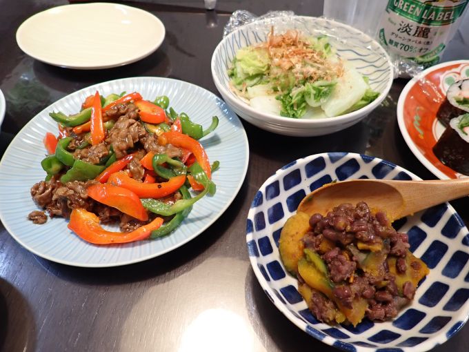 青椒肉絲(クックドゥ2人前ので)、白菜お浸し、冬至かぼちゃ、柚子大根