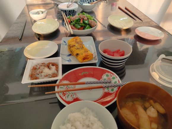 ごはん、お味噌汁、塩昆布玉子焼き、大根おろし納豆、タラコ、ツナサラダ、ごはんのお供色々
