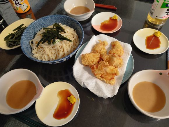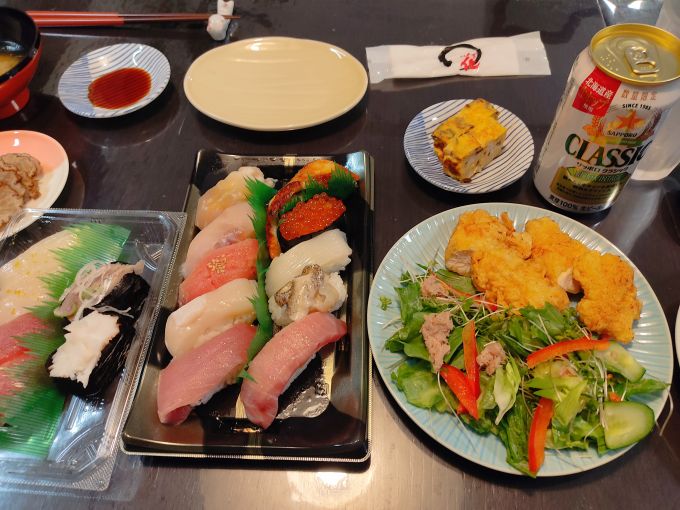 お寿司、とり天とサラダ、私はビアと朝の残りの塩昆布玉子焼き。