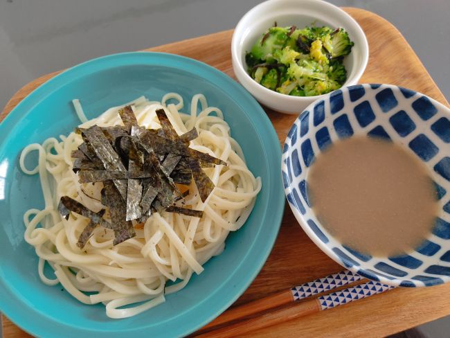 冷しうどん(胡麻だれ)、ブロッコリー塩昆布ごま和え