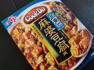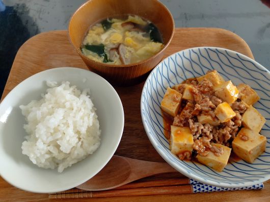 ごはん、創味シャンタンスープ(卵、椎茸、ワカメ)、麻婆豆腐(CooKDo)