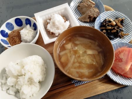 ごはん、お味噌汁(白菜、しめじ、揚げ)、トマト、なめ茸おろし、納豆おろし、いぶりがっこ、ひじき煮