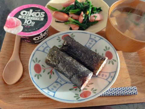 明太子巻き巻き、お味噌汁(豆腐、かに入りすり身、三つ葉)、ほうれん草ウインナーソテー、オイコス1/2
