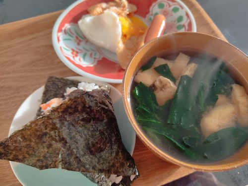 明太子おにぎり、お味噌汁(ほうれん草、揚げ)、目玉焼き、ウインナー