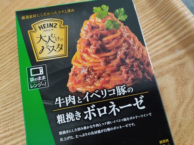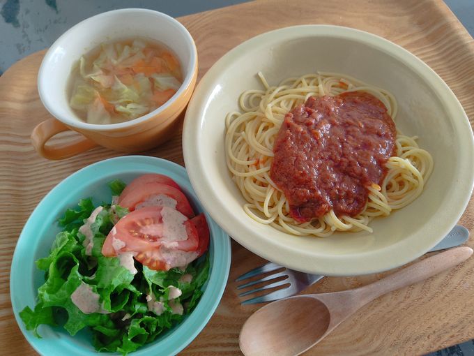 レトルトボロネーゼ、サラダ、野菜コンソメスープ