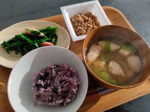 黒豆ごはん(冷凍チン)、お味噌汁(カニ入りすり身、豆腐、白菜)、納豆、ウインナーほうれん草炒め