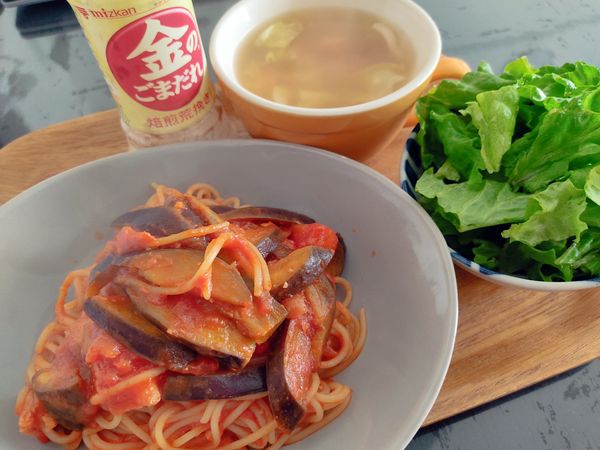茄子ベーコントマトソースパスタ、サラダ、コンソメスープ(キャベツ人参ベーコン)、サラダ