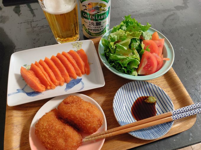 サーモンお刺身、クリームコロッケ、サラダ、淡麗グリーンx1