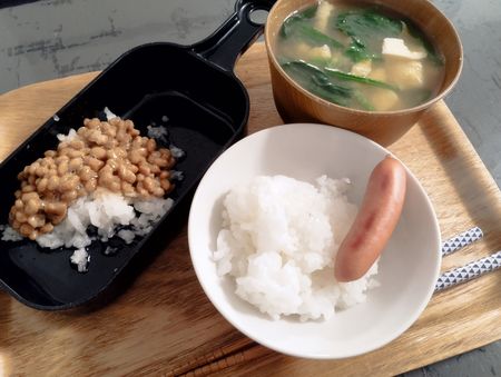 ごはん+ウインナー、大根おろし納豆、お味噌汁(豆腐、揚げ、ほうれん草)