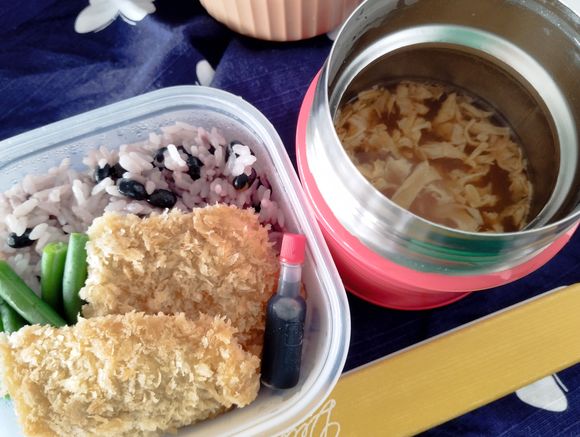 黒豆ごはん、ひらめフライ、いんげん、ふかひれスープ(インスタント)