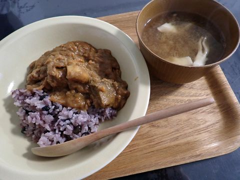 黒豆ごはんとポークカレー、しめじ舞茸お味噌汁