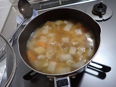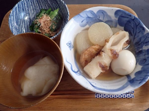おでんx(2倍)、おでん汁+お餅、小松菜お浸し