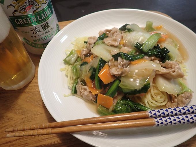 今日の晩酌開始は野菜たっぷりあんかけ焼きそばで