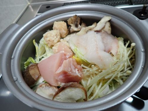 鶏もも、タラ、肉団子、椎茸、舞茸、えのき、白菜で