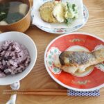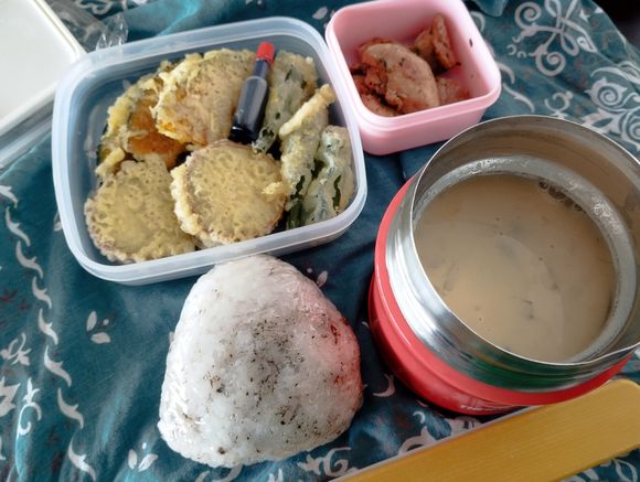 梅干しゆかりごはん、豆乳お味噌汁(白菜、ベーコン、しめじ)、昨日の野菜天ぷら、鶏ももスパイス焼き