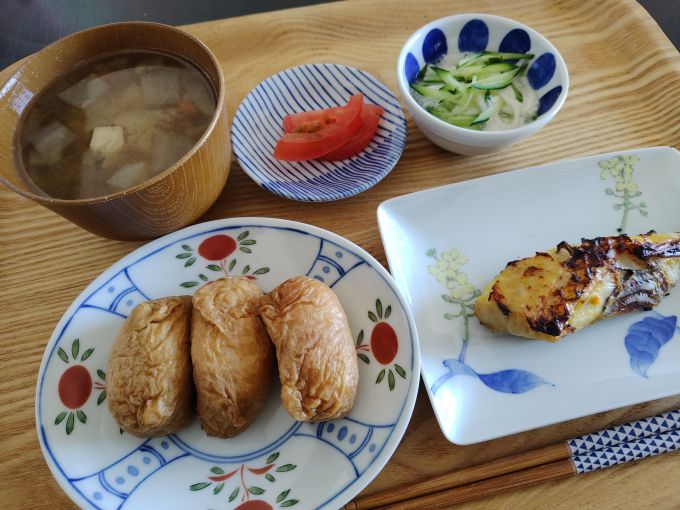 自家製冷凍いなり寿司、あこうだい西京漬、根菜お味噌汁、トマト、長芋胡瓜かんたん酢