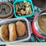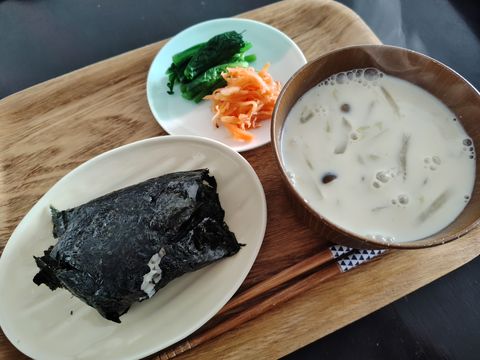 ツナマヨおにぎり、豆乳お味噌汁(白菜、しめじ、ベーコン)、ほうれん草、人参ナムル