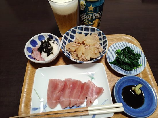 まぐろお刺身(特売冷凍解凍)、まぐろ山かけ、大根ひき肉煮、ほうれん草お浸し、ホワイトベルグx1