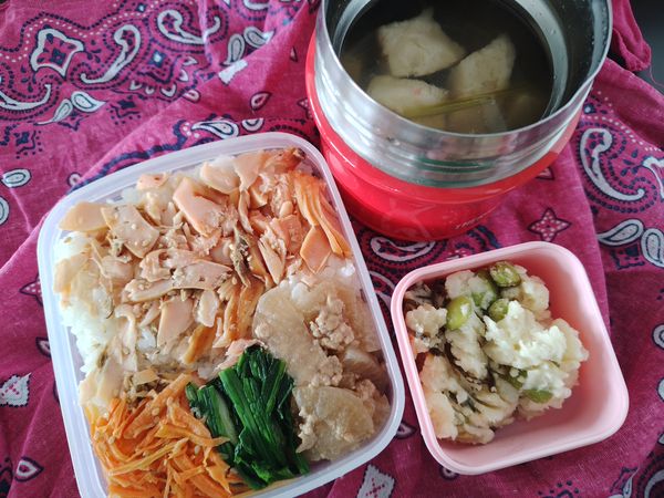 まるごと冷凍弁(ほぐし鮭、人参ナムル、ほうれん草、大根ひき肉煮)、作り置きポテサラ、お味噌汁(朝と同じ)