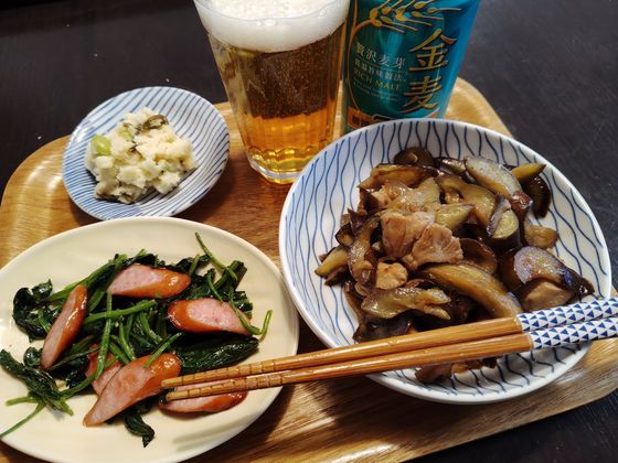 ポテサラ(作り置き完食)、ウインナほうれん草炒め、鶏もも茄子かんたん酢炒め、金麦糖質オフ1